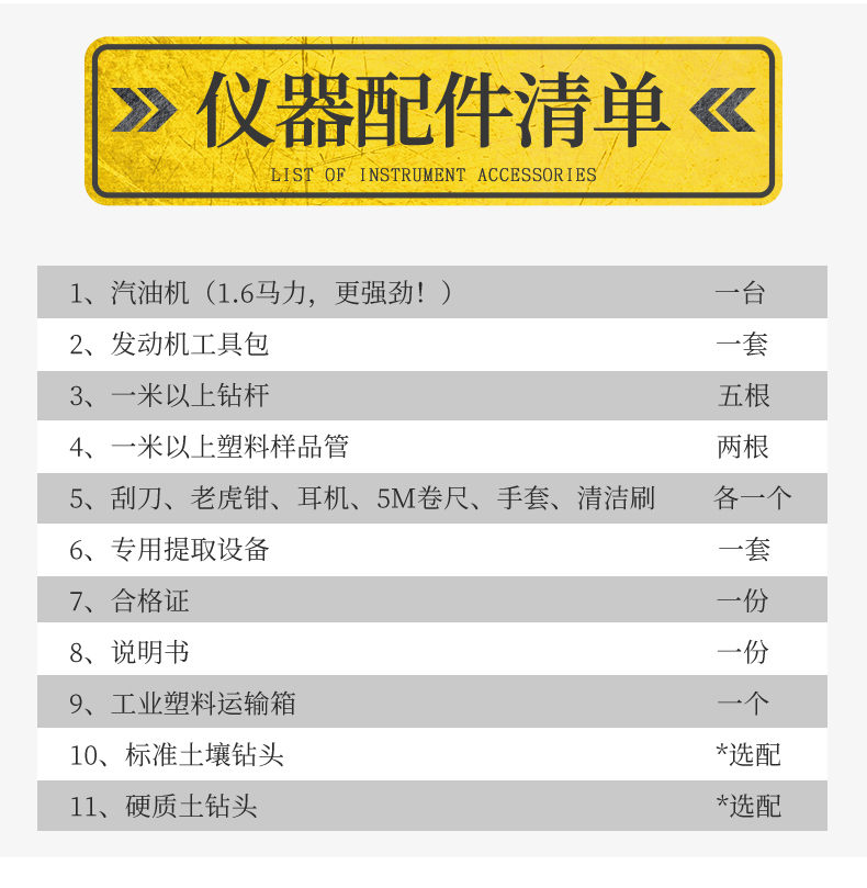 汽油動力發動機一臺,發動機工具包一套,標準土壤鉆頭、硬質土鉆頭隨意選配,不小于1米的鉆桿5根、不小于1米的塑料樣品管2根,刮刀、老虎鉗、耳機、5M卷尺、手套、清潔刷各1個,專用提取設備1套、工業塑料運輸箱1個